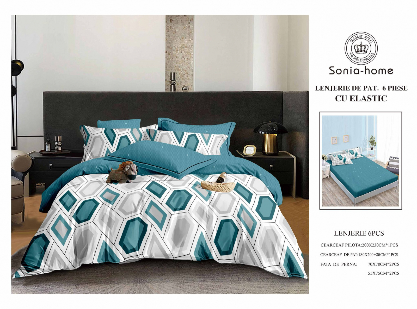 Lenjerie de pat bumbac, cu 6 piese ,cu elastic, cu doua fete produsa de Sonia Home Romania din finet de cea mai buna calitate.
